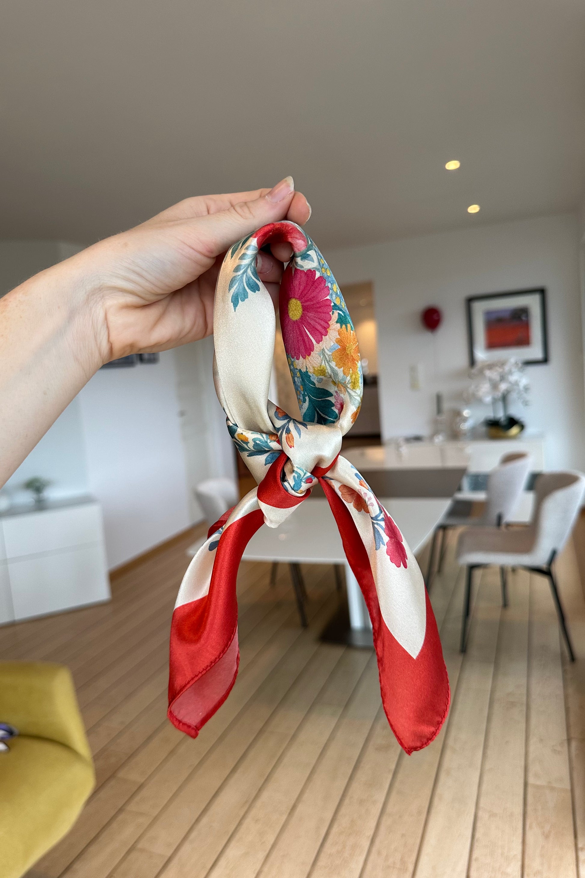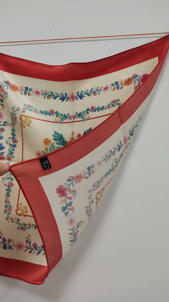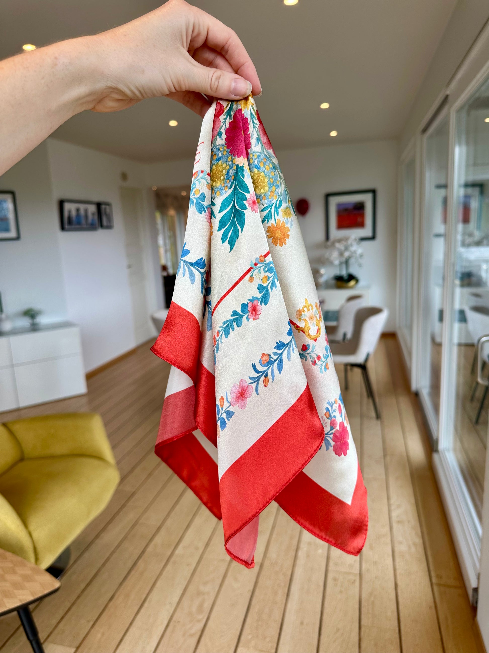Eksklusivt skjerf i 100% ren silke. Med dette silkeskjerfet er du alltid elegant og klassisk, samtidig som silkeskjerf også preger trendbildet. Bruk det rundt halsen, i håret, som belte eller på vesken- her er det bare å være kreativ!