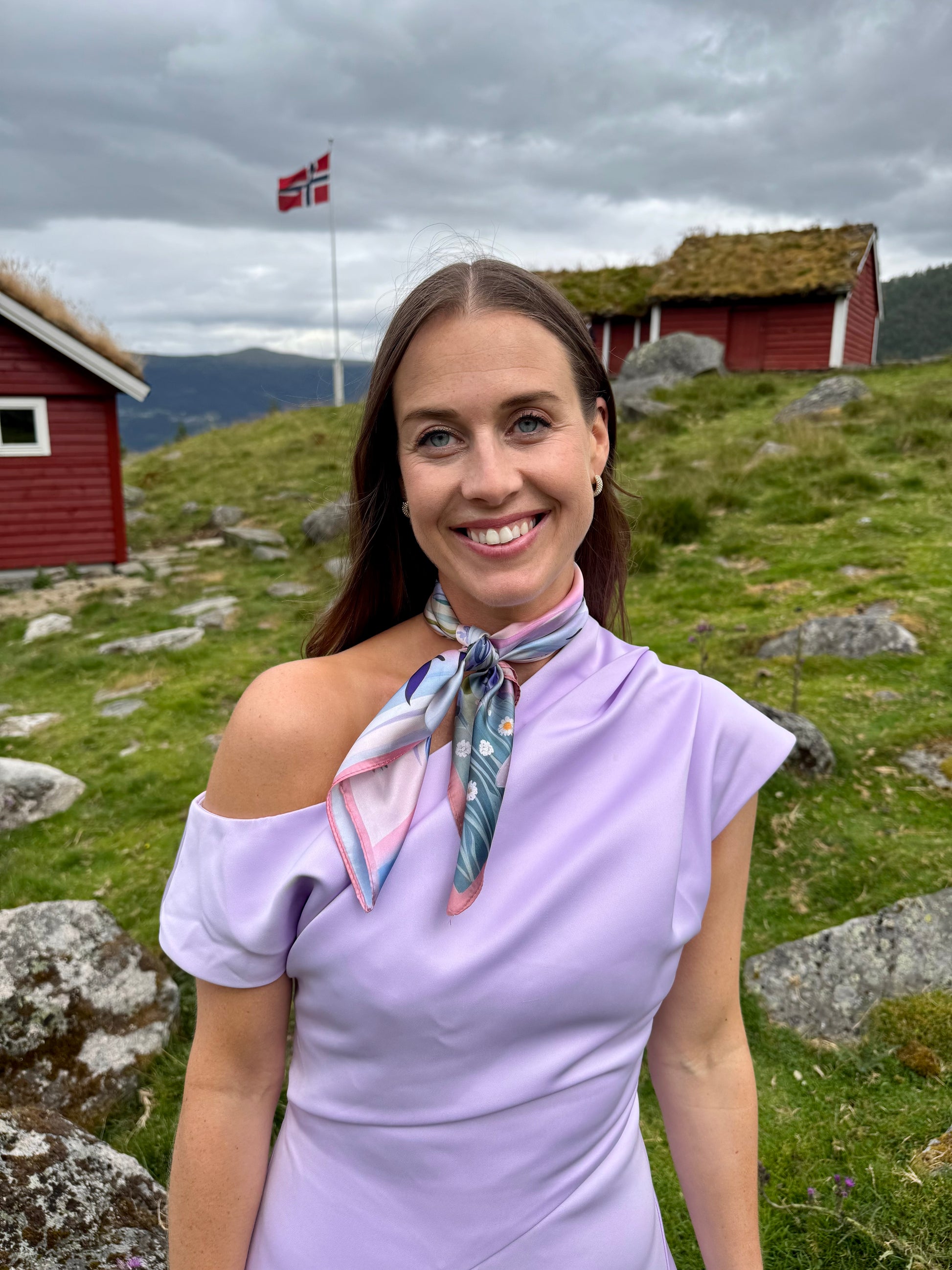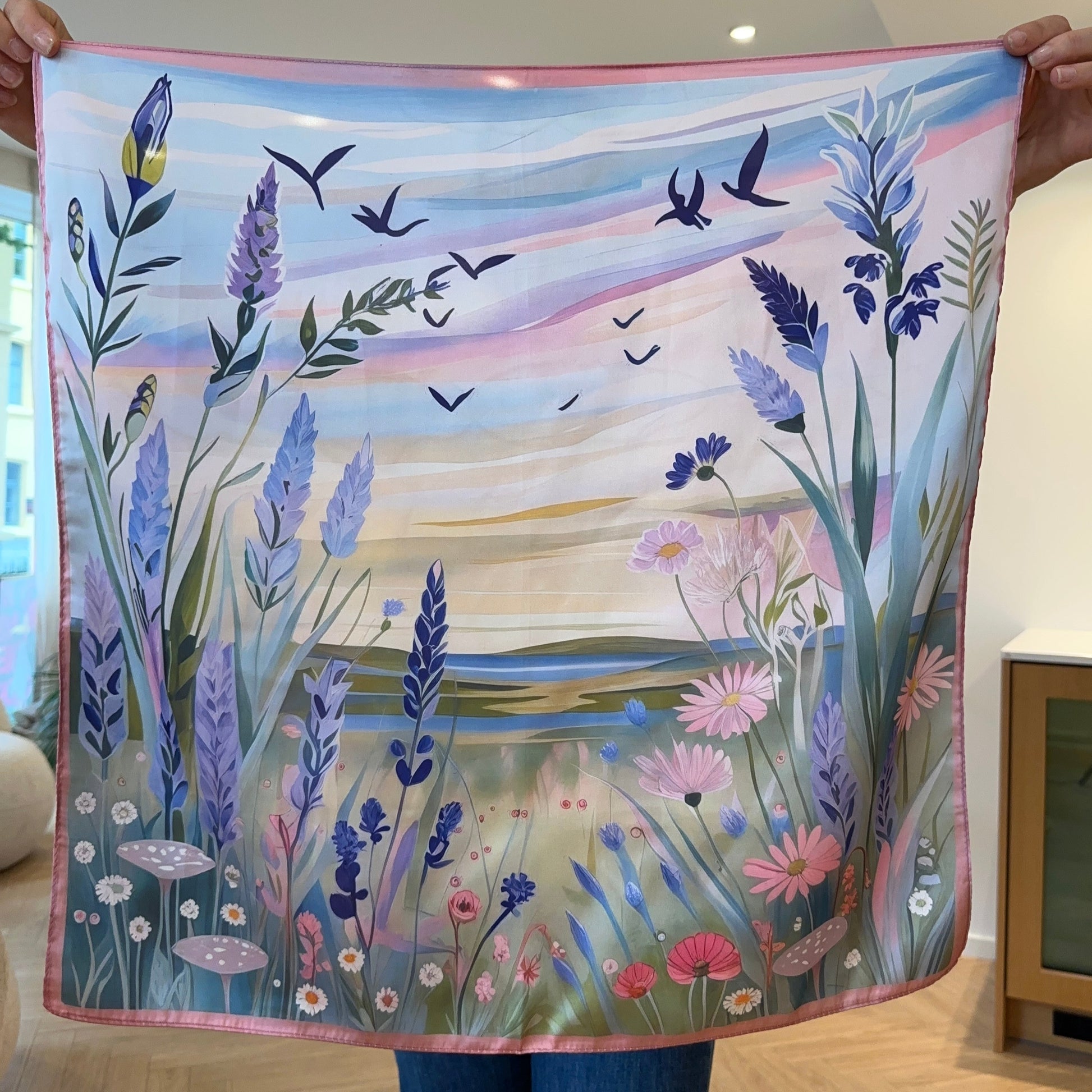 La naturens ro og fargerikdom følge deg hvor enn du går. Dette eksklusive sjalet er prydet med et landskapsmotiv inspirert av norske fjorder, ville blomsterenger og majestetiske fjell i solnedgang.