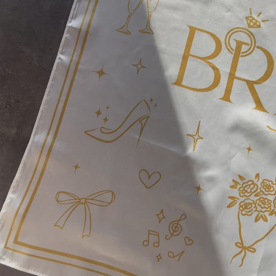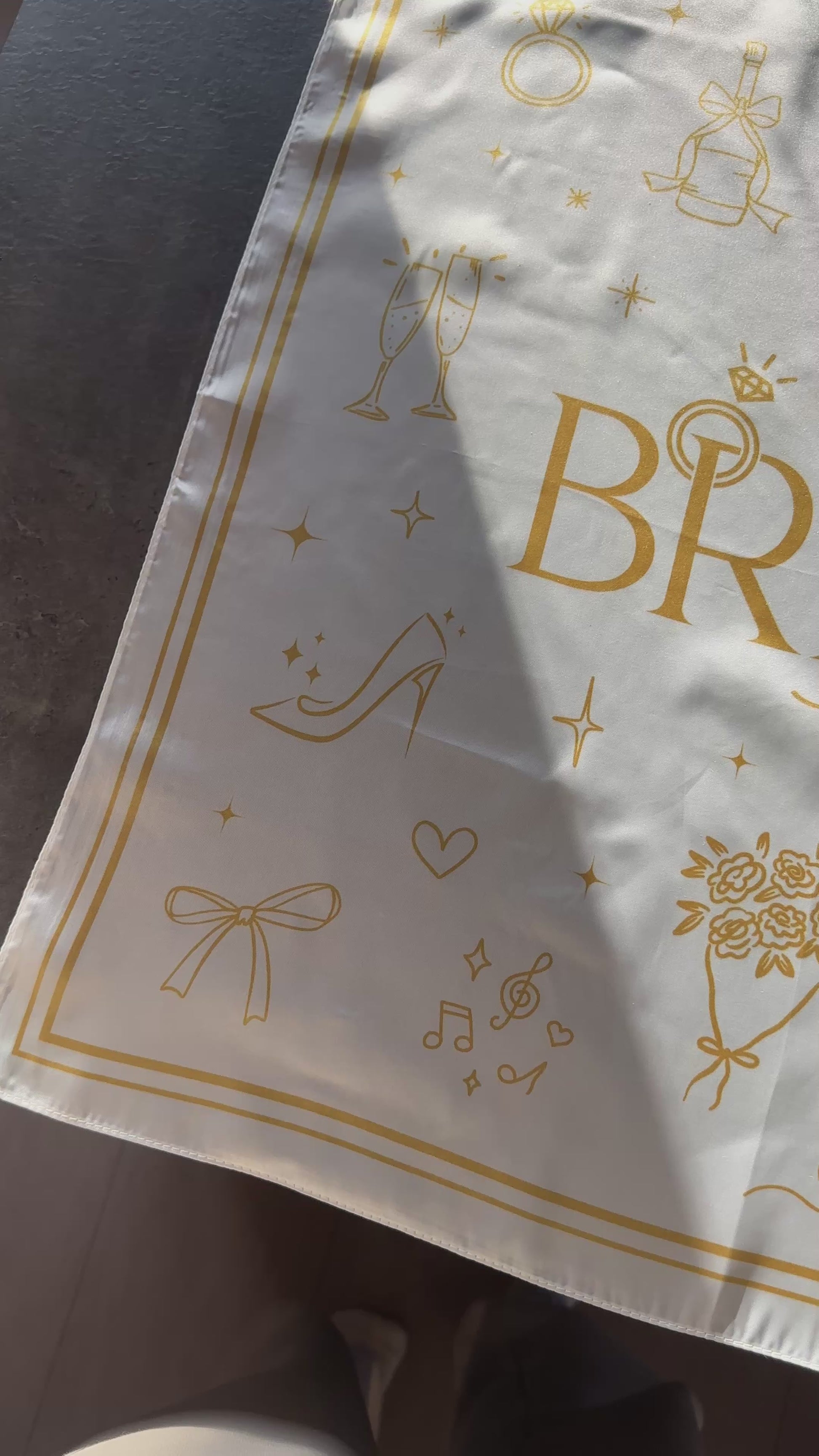 Elegant og mykt satengsjal med "BRIDE"-design – det perfekte tilbehøret til utdrikningslaget eller bryllupshelgen. Sjalet har en luksuriøs glans og faller fint over skuldrene, og gir en festlig og gjennomført look for brudens følgesvenner. En fin gave og et minne fra en uforglemmelig feiring!